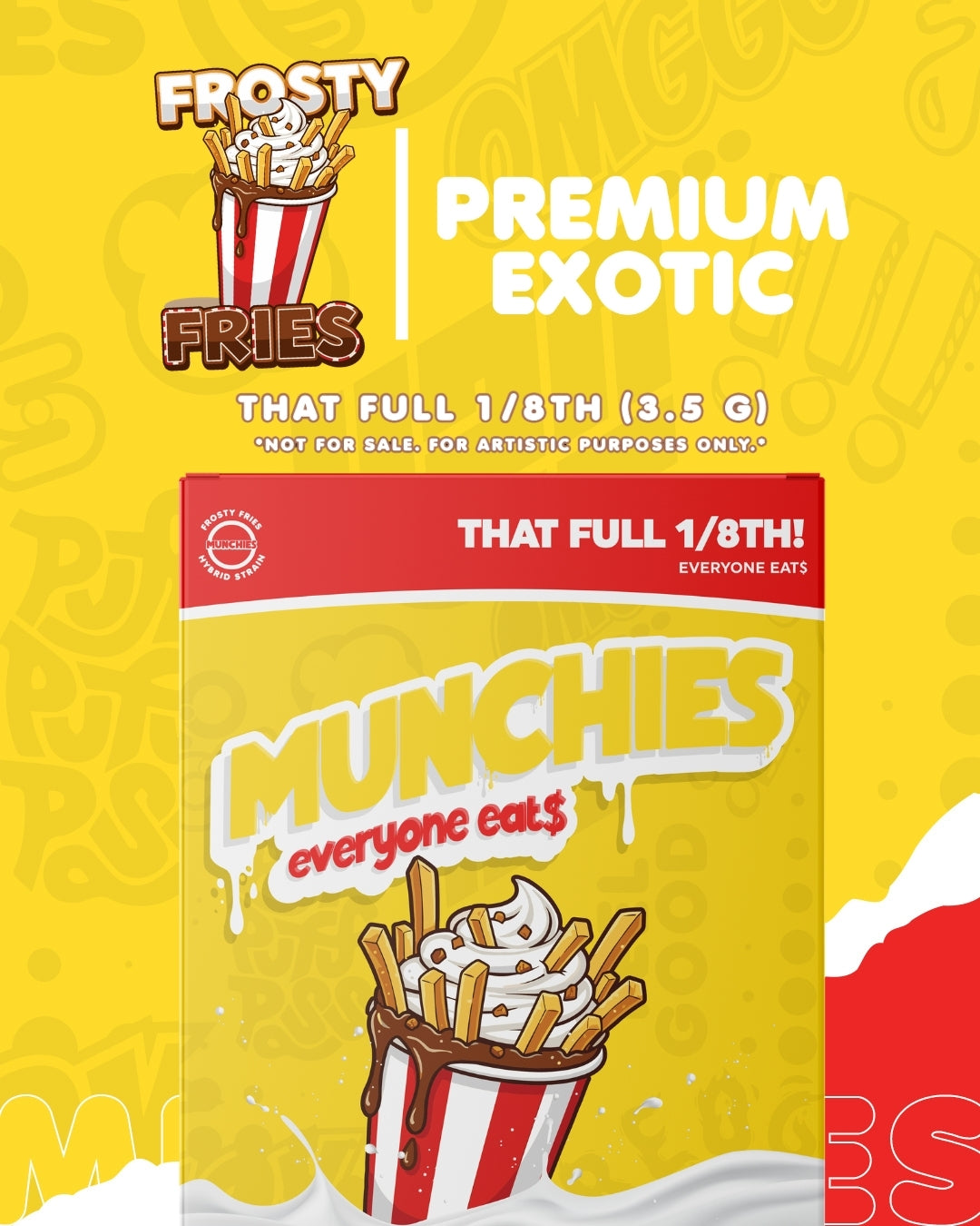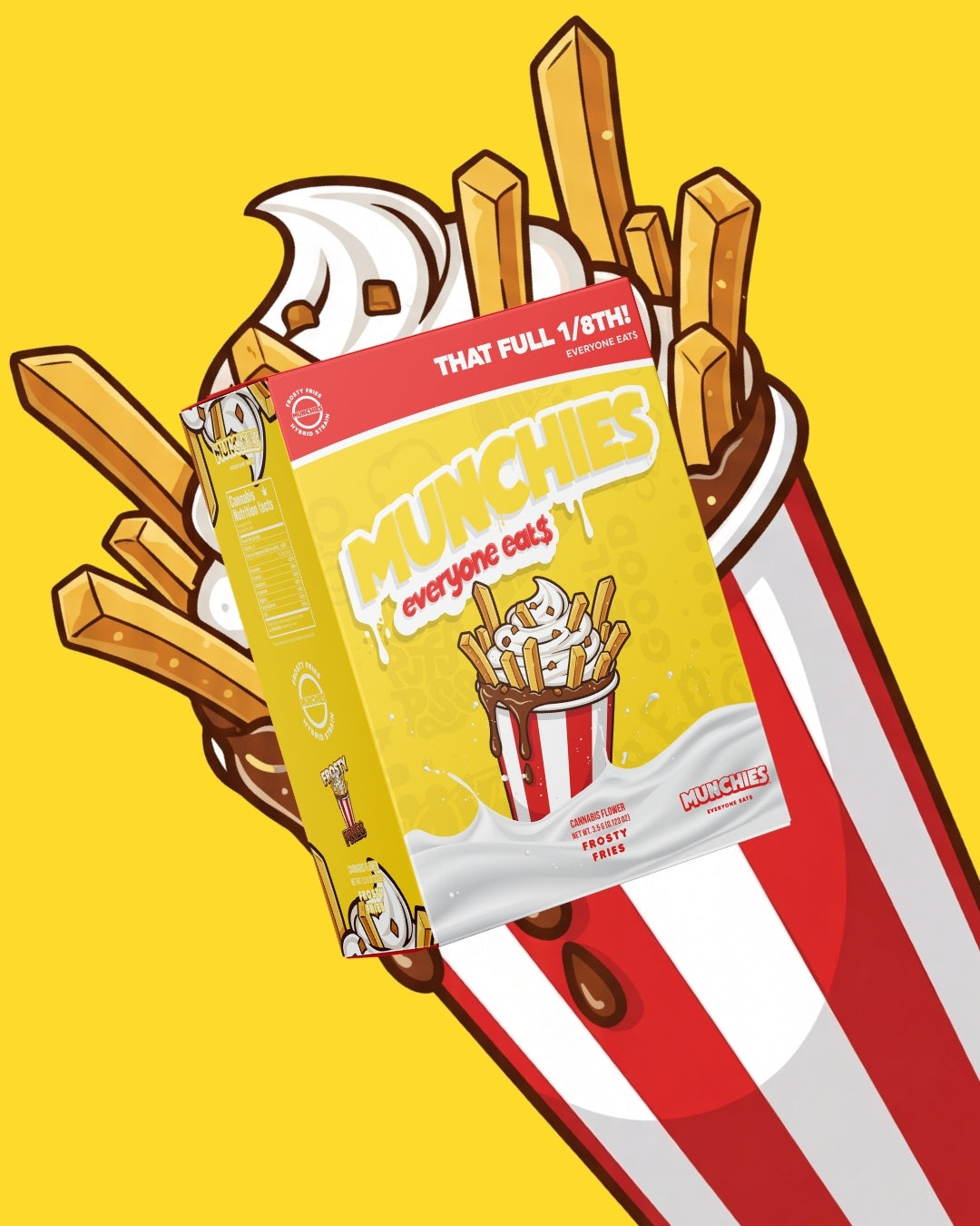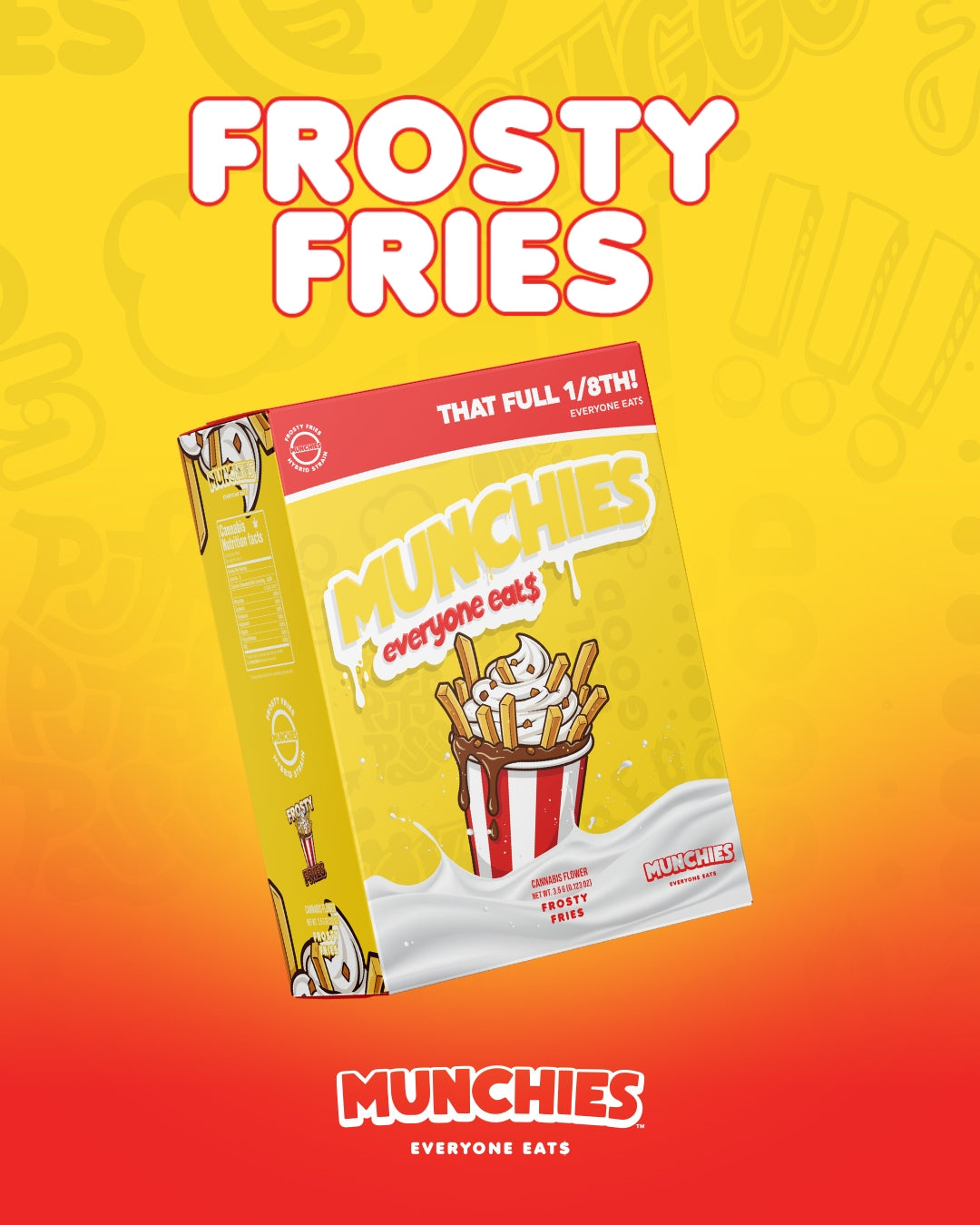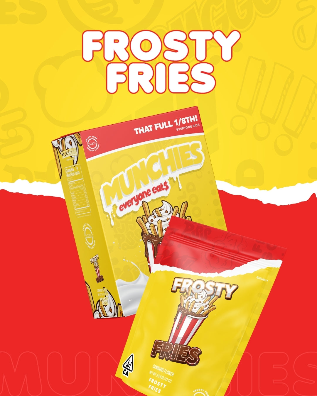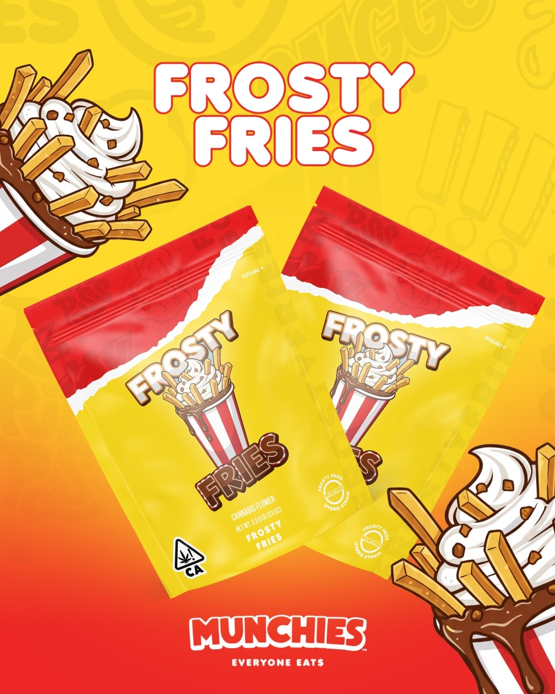 Frosty Fries is a dessert-inspired strain that delivers a smooth high with a bright cerebral lift followed by relaxing body calm. Made from Potato Runtz and Gelato #41, it features sweet notes of vanilla cream reminiscent of a frosty dessert treat. The effects begin with a cheerful head buzz before settling into a mellow, laid-back body relaxation. Perfect for the afternoon or evening, Frosty Fries delivers a bright, uplifting buzz that sparks a cheerful and easygoing mood. Its smooth, calming body effects help melt away tension while keeping the experience balanced, relaxed, and comfortably mellow.