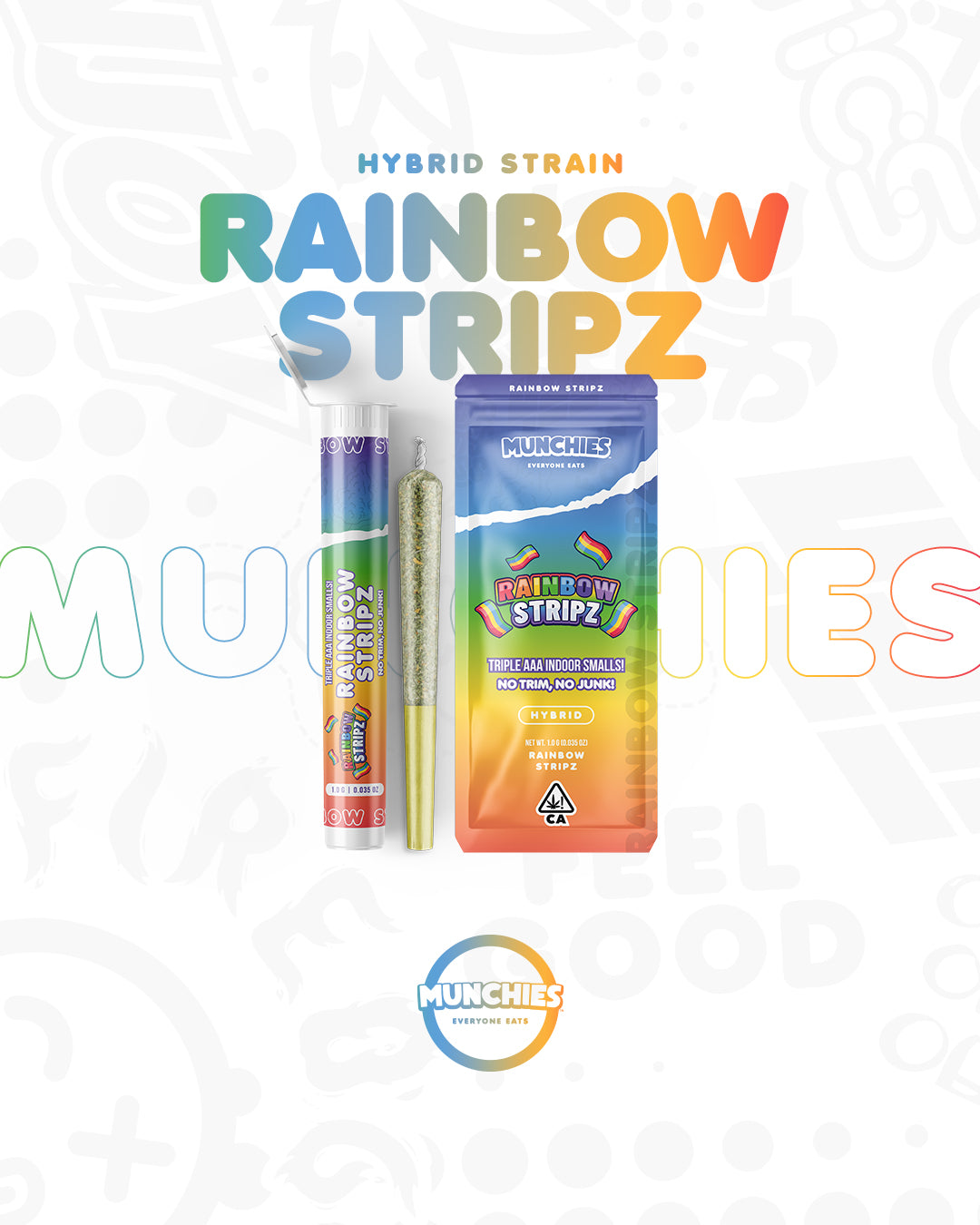 Discover the vibrant and uplifting experience of Rainbow Stripz by Munchies! Immerse yourself in the vibrant flavors that will take you to a place of bliss. Rainbow Stripz is a unique hybrid cross strain, not just for their visually stunning array of colors, but also for the sensations they induce - relaxed, happy, and euphoric.